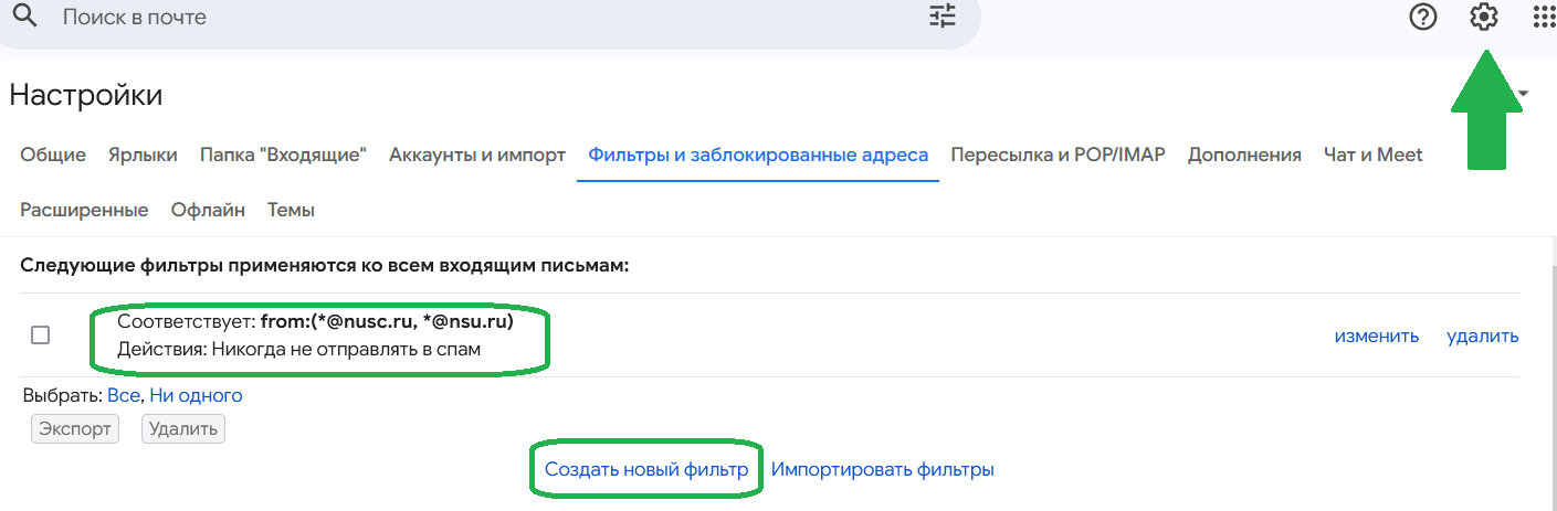 - В «Следующие фильтры применяются ко всем входящим письмам» нажать на «Создать новый фильтр».